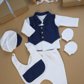 Set 5 piese bebeluși din muselină premium cu vestă bleu