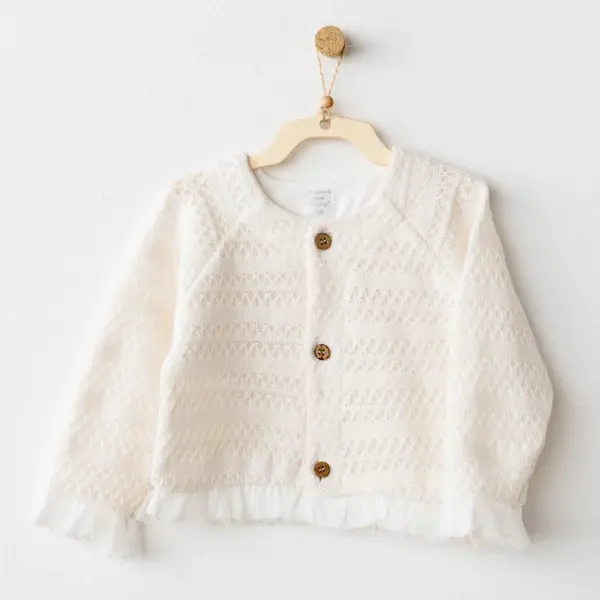 Un cardigan adorabil pentru micile prințese! Tricotat fin și decorat cu volănașe delicate, acest cardigan crem adaugă o notă elegantă oricărei ținute.
