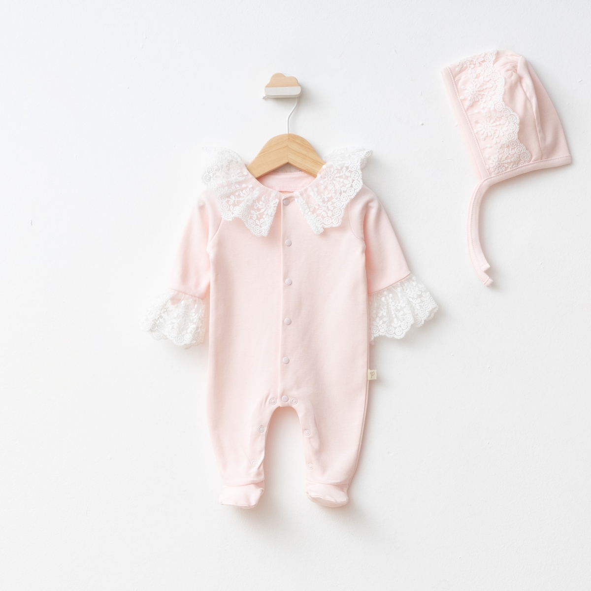 Piesa principală este tulumul dintr-un bumbac extrem de fin. Acesta surprinde prin gulerul bogat din dantelă albă, lucrată cu mare atenție. Aceeași dantelă fină se regăsește și la mâneci, adăugând un plus de eleganță. Setul este completat de o bonețică adorabilă care protejează capul bebelușului cu blândețe.