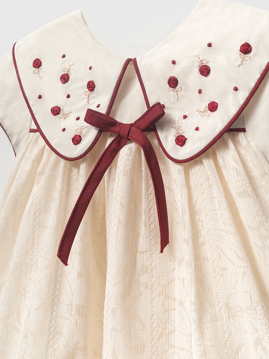 Textura materialului este extrem de fină și plăcută la atingere. Am ales materiale de calitate superioară pentru a proteja pielea sensibilă a fetiței tale. Croiala este gândită să ofere lejeritate, permițându-i să se simtă confortabil pe tot parcursul zilei. Nuanța caldă de crem, pusă în evidență de accentele bordo, oferă un contrast vizual deosebit.