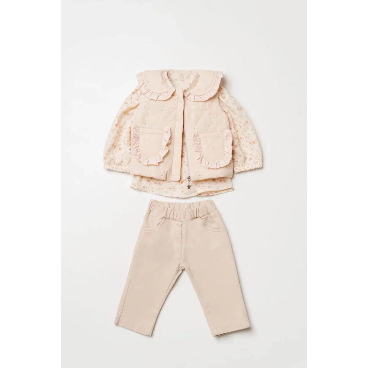 Piesa principală este vesta matlasată. Aceasta are volănașe delicate la buzunare și un guler rotund, oferind un strat de căldură ideal. Bluza cu imprimeu floral mărunt aduce un plus de eleganță și prospețime. Pantalonii sunt prevăzuți cu o bandă elastică lejeră în talie. Aceștia permit micuței tale să se miște liber întreaga zi.