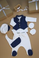Set 5 piese bebeluși din muselină premium cu vestă bleu