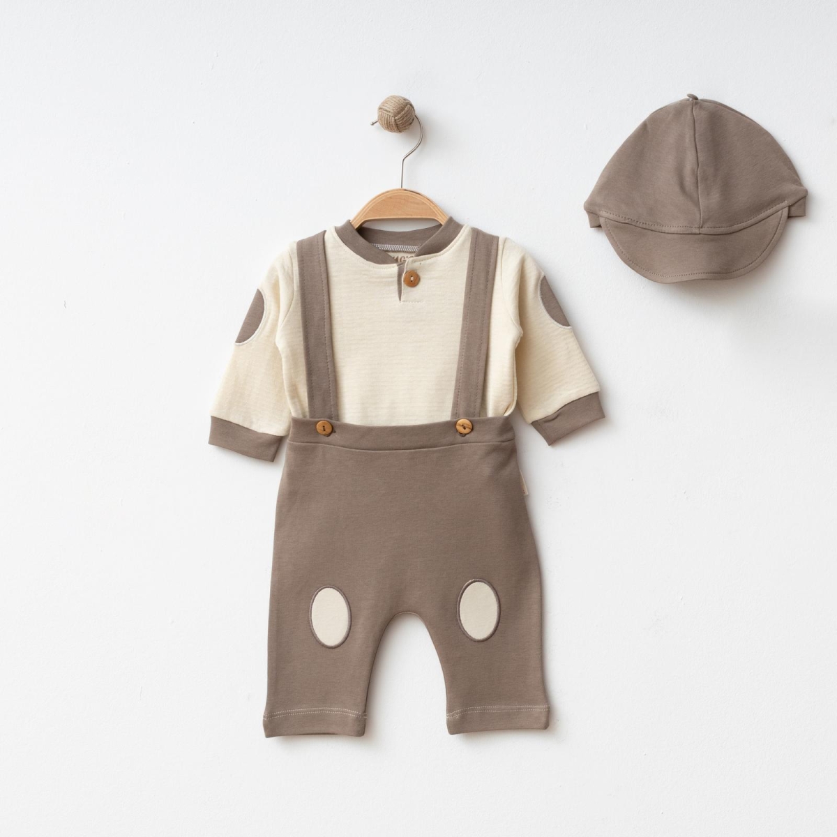 Confortul pielii este prioritatea noastră. Setul este confecționat dintr-un bumbac organic de o finețe rară, lăsând pielea să respire natural. Materialul moale previne iritațiile și oferă libertate totală de mișcare. Pantalonii cu bretele și nasturi decorativi din lemn adaugă un farmec aparte, în timp ce șepcuța asortată completează perfect ținuta, oferind protecție și un aer sofisticat.